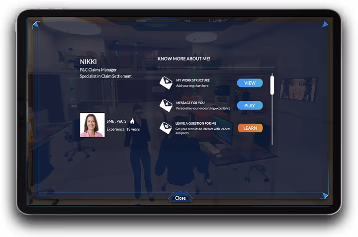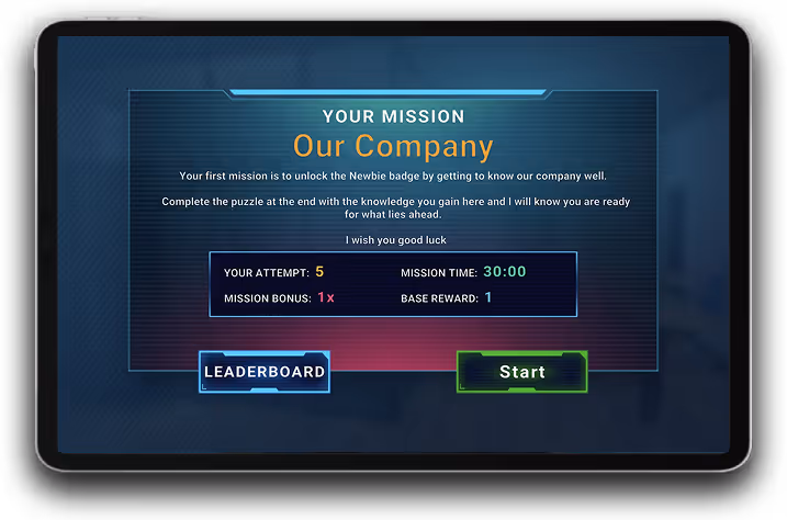 Branding, login, virtual HQ design, and mission framework configured to your induction flow.