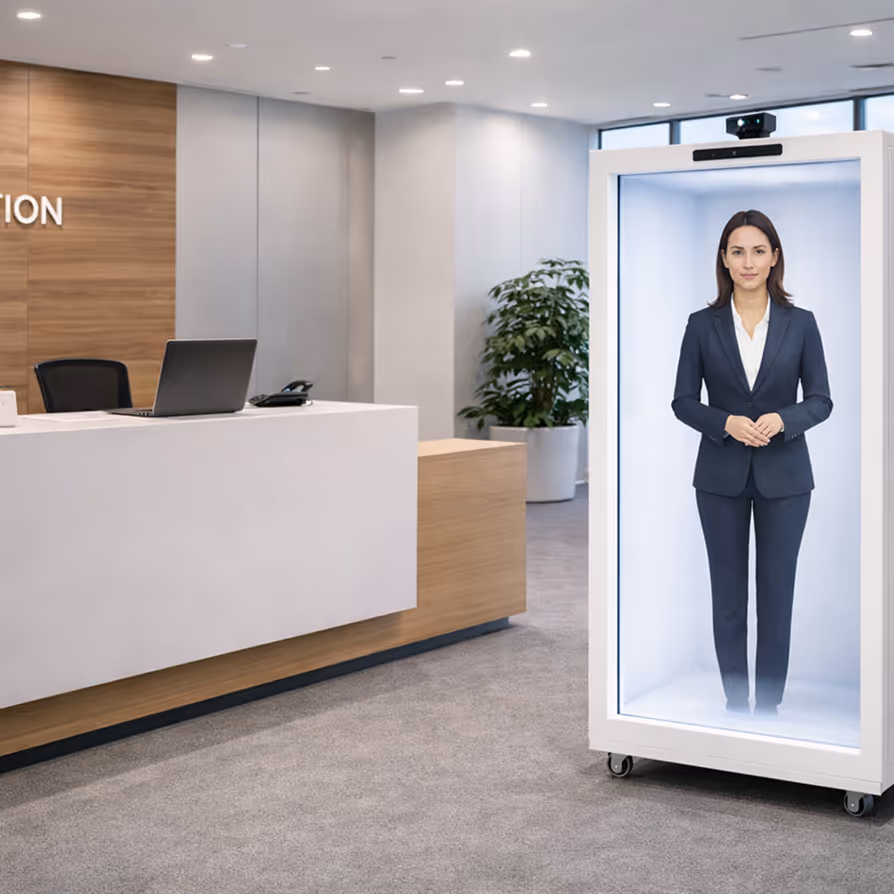HoloBox is a 7‑foot, 86" 4K holographic display that renders full‑body, life‑size holograms of leaders, mascots, and products inside a transparent enclosure. It creates the optical illusion that a real person is standing inside the box—delivering human connection at digital scale.