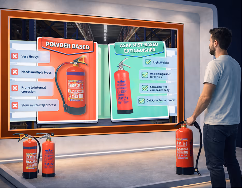 A 90-second, hands-on gamification experience where visitors use real Aska fire extinguishers to control fire on a massive LED screen.